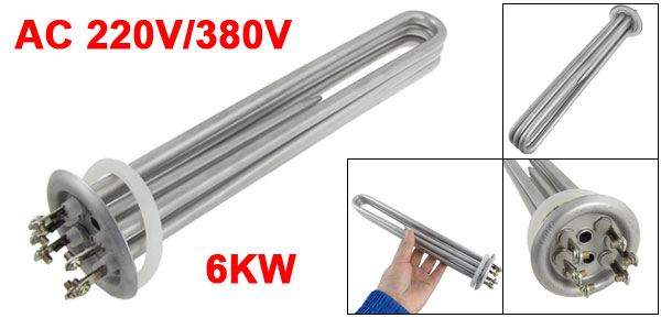Product Name Water Heater Element Shape 3U Tube Bundle Type Main Material Stainless Steel Rated Voltage AC 220V/380V Power 6KW Bar Diameter 8mm/ 0.31" Silicone Ring Dia. 60mm/ 2.4" Overall Size(Approx.) 28.5 x 6.5cm/ 11.1" x 2.5"(L*Max.D) Thread Diameter 3.9mm / 0.15" Color Silver Tone Weight 454g Package Content 1 x Water Heater Element