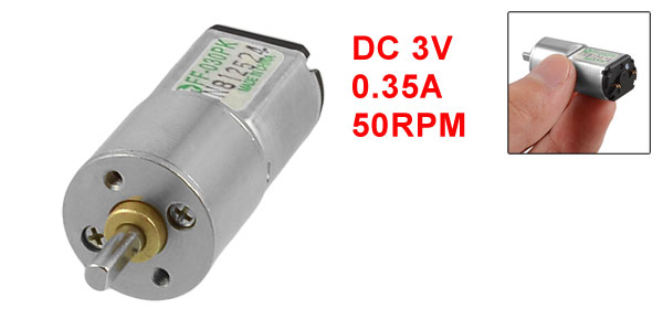 Product Name DC Geared Motor Model Type 16GA Rated Voltage DC 3V Current 0.35A Speed 50RPM Shaft Size 3 x 11mm/ 0.12" x 0.45"(D*H) Body Size 16 x 34mm / 0.63"x 1.3"(Max.D*H) Total Length 45mm / 1.8" Main Color Silver Tone Main Material Metal Weight 23g Package 1 x DC Geared Motor - Reviews