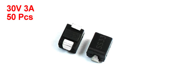Product Name Schottky Diode Model SS33 Package Type DO-214AA Max Repetitive Peak Reverse Voltage 30V Max Average Forward Rectified Current 3A Size 5.5 x 3.7 x 3mm / 0.22" x 0.15" x 0.12" (L*W*T) Color Silver Tone, Black Weight 10g Package Content 50 (±2%) x Schottky Diode - Reviews