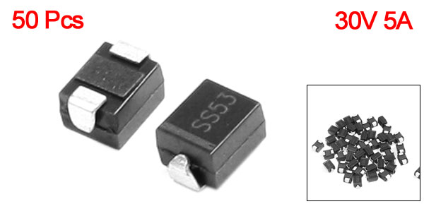 Product Name Schottky Diode Model SS53 Package Type DO-214AA Max Repetitive Peak Reverse Voltage 30V Max Average Forward Rectified Current 5A Size 5.5 x 3.7 x 3mm / 0.22" x 0.15" x 0.12" (L*W*T) Color Silver Tone, Black Weight 10g Package Content 50 (±2%) x Schottky Diode - Reviews