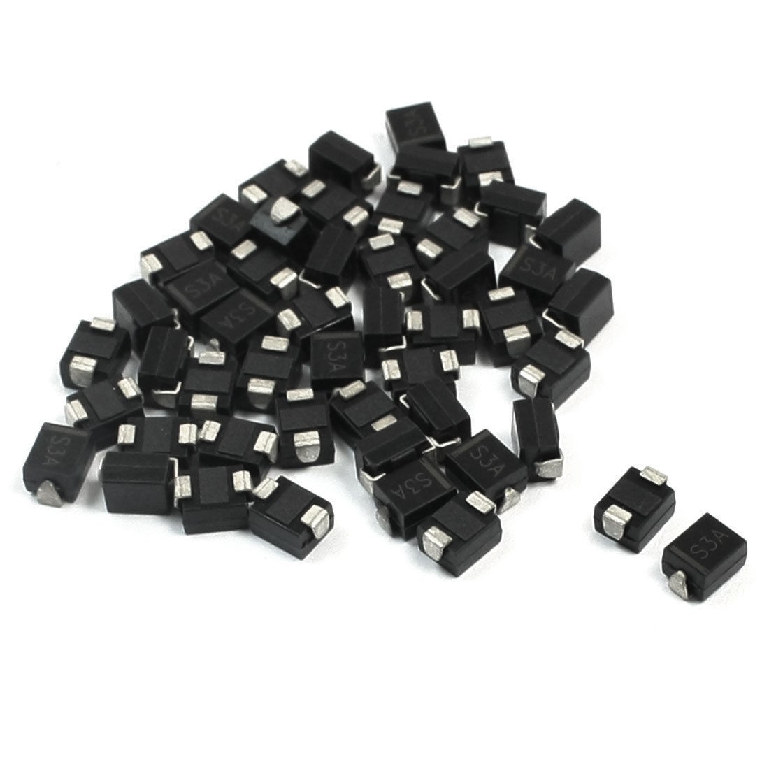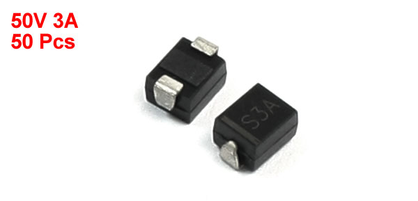 Product Name Rectifier Diode Model S3A Package Type DO-214AA (SMB) Max Repetitive Peak Reverse Voltage 50V Max Average Forward Rectified Current 3A Size 5.5 x 3.7 x 3mm / 0.22" x 0.15" x 0.12" (L*W*T) Color Silver Tone, Black Weight 10g Package Content 50 (±2%) x Rectifier Diode - Reviews
