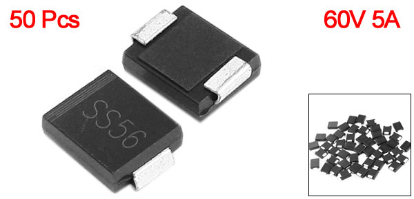 DetailsElectric Components DO-214AB 60V 5A Schottky Diode SS56-C 50pcs  Product Name Schottky Diode Model SS56-C Package Type DO-214AB Max Repetitive Peak Reverse Voltage 60V Max Average Forward Rectified Current 5A Size 7.5 x 5.7 x 2.4mm / 0.3" x 0.23" x 0.09" (L*W*T) Color Silver Tone, Black Weight 15g Package Content 50 (±2%) x Schottky Diode