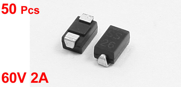 Product Name Schottky Diode Model SS26 Package Type DO-214AC (SMA) Max Repetitive Peak Reverse Voltage 60V Max Average Forward Rectified Current 2A Size 5 x 2.5 x 2.2mm / 0.2" x 0.1" x 0.087" (L*W*T) Color Silver Tone, Black Weight 6g Package Content 50 (±2%) x Schottky Diode - Reviews
