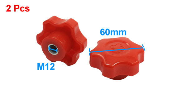 DetailsElectric Machine M12 Female Thread 60mm Dia Clamping Hex Knob 2pcs  Product Name Clamping Knob Type Screw On Head Diameter 60mm /2.4" Fit for Screw M12 Total Height 33mm / 1.3" Material Metal, Plastic Color Red Weight 76g Package Content 2 x Clamping Knob