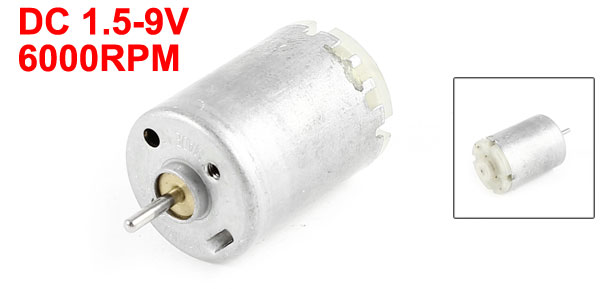 Product Name DC Motor Rated Voltage DC 1.5-9V Speed 6000RPM Shaft Diameter 1.5mm/ 0.06" Shaft Length 6mm/ 0.24" Body Diameter 17 x 23mm/ 0.6" x 0.9"(D*L) Main Color Silver Tone Material Metal Weight 19g Package 1 x DC Motors - Reviews