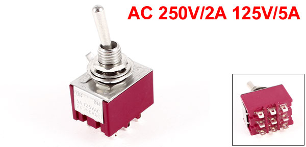 Product Name Toggle Switch Contact Tyoe 3PDT 9Pin Voltage / Current AC 250V/2A 125V/5A Size 18 x 12 x 30mm / 0.7" x 0.5" x 1.2"(L*W*H) Color Red, Silver tone Weight 8g Package Content 1 x Toggle Switch - Reviews