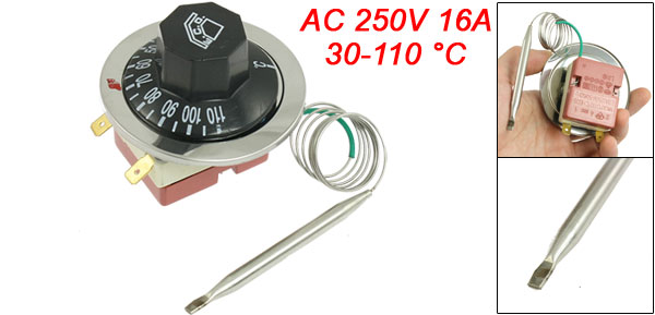 Product Name Temperature Switch Controller Use for Any Electrical Device Which Need Temperature Control Action Type NC(Normal Close) Control Temerature 30-110 celsius Material Plastic, Resion, Metal Power AC 250V 16A Frequency 50/ 60Hz Connect Method Two pin connect to power electro circuit Knob Color Black, Blue Stick Diameter 6mm / 0.23" Stick Tip Width 4mm / 0.15" Contact Stick Length 73mm / 2.9" Size 6.7 x 5.5cm / 2.6" x 2.2" (D*T) Weight 94g Package Content 1 x Temperature Controller Switch - Reviews