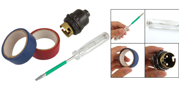 DetailsElectric Slotted Tip Testing Pen + Tape + Bulb Holder  Product Name Electric Tester Pen + Tape + Bulb Holder Testing Range 100 - 1000V Tester Pen Size 13.3 x 1.5cm/ 5.2" x 0.6" (L*D) Pen Tip Width 3.5mm/ 0.138" Tape Roller Size 4.7 x 1.7cm/ 1.85" x 0.67" (D*W) Lamp Base Size 3.8 x 5.3cm/ 1.5" x 2.1" (D*H) Color As picture shown Material Plastic, Metal Net Weight 58g Package 1 x Electric Tester Pen 2 x Electric Adhesive Tape 1 x Bulb Holder