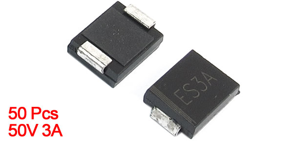 Product Name Ultra Fast Diode Model ES3A-C Package Type DO-214AB (SMC) Max Repetitive Peak Reverse Voltage 50V Max Average Forward Rectified Current 3A Size 7.5 x 5.7 x 2.4mm / 0.3" x 0.23" x 0.09" (L*W*T) Color Silver Tone, Black Weight 15g Package Content 50 (±2%) x Ultra Fast Diode - Reviews