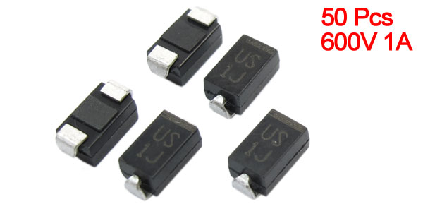 Product Name High Efficiency Rectifier Diode Model US1J Package Type DO-214AC Max Repetitive Peak Reverse Voltage 600V Max Average Forward Rectified Current 1A Size 5 x 2.5 x 2.2mm / 0.2" x 0.1" x 0.087" (L*W*T) Color Silver Tone, Black Weight 6g Package Content 50 (±2%) x High Efficiency Rectifier Diode - Reviews
