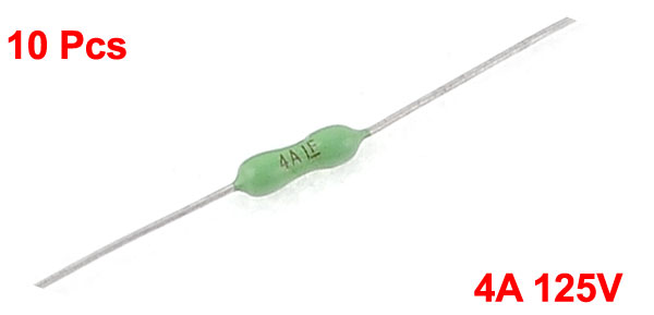 Product Name Resistor Fuse Current 4A Type F Fuse Size 6 x 3 mm / 0.24" x 0.1" (D*L) Total Length 6cm / 2.4" Main Material Metal Color Silver Tone, Green Weight 3g Package 10 x Thermal Fuse - Reviews