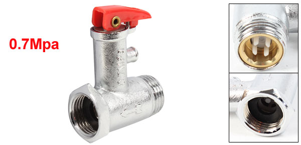 Product Name Safety Valve Material Metal Color Red, Silver Tone Pressure 0.7Mpa Male Thread Dia. 21mm/1/2" PT Female Thread Dia 18.6mm//1/2" PT Barb Diameter 4.5mm/0.18" Overall Size 6 x 4.5 x 2.5cm/2.36" x 1.77" x 0.98"(L*W*T) Net Weight 80g Package Content 1 x Water Heater Safety Valve - Reviews