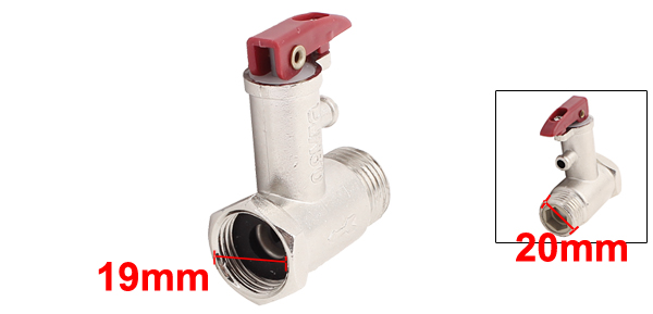 Product Name Water Heater Safety Valve Male Thread Dia (Approx.) 1/2BSP(20mm) Female Thread Dia (Approx.) 1/2BSP (19mm) Pressure 0.9Mpa Overall Size (Approx.) 60 x 44 x 24mm /2.4" x 1.7" x 0.9"(L*W*T) Material Brass, Plastic Color Silver Tone, Red Weight 83g Package Content 1 x Water Heater Safety Valve - Reviews