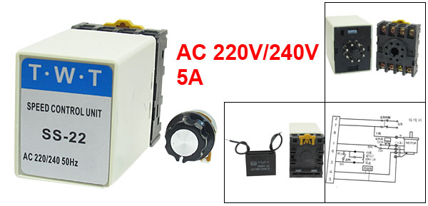 Product Name AC Motor Speed Controller Model SS-22 Material Plastic, Electronic Part Power Supply AC 220V/240V Frequency 50HZ Current 5A Motor Power 6-90W Speed Adjustable Range 90-1700 RPM Capacitance