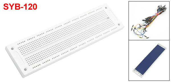 Product Name Breadboard Jumper Wire Set Breadboard Type SYB-120 Breadboard Size 177 x 46 x 8mm / 7" x 1.8" x 0.31" (L*W*T) Jumper Wire Length(Approx) 100mm / 3.9"(the Shortest) Material Plastic, Metal Net Weight 104g Package Content 1 x Breadboard