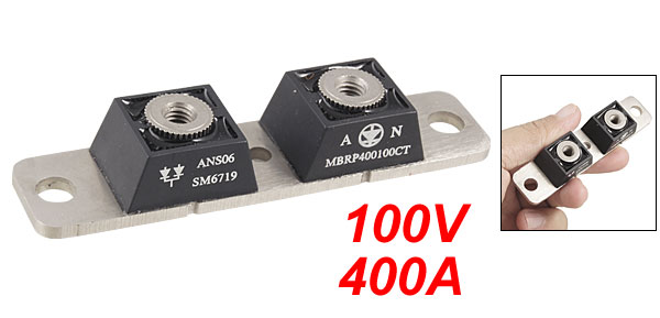 Product Name Schottky Barrier Diode Module Model No. MBRP400100CT VRRM 100V IFRM 400A IFSM 2500A IRRM 2A Female Thread Size 4.7 x 7.8mm / 0.185" x 0.307"(D*H) Tstg -55 to + 175°C Total Size 92 x 20 x 15mm/ 3.62" x 0.79" x 0.59" (L* W * H) Weight 80g Package 1 x Schottky Barrier Diode Module - Reviews