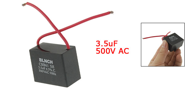 Product Name Motor Capacitor Model CBB61 Material(External) Plastic Rated Capacitance 3.5uF Tolerance ±5% Rated Frequency 50Hz Rated Voltage 500V AC Size 3.7 x 3 x 2cm/1.4" x 1.2"x 0.8"(L*W*T) Cable Length 7.5cm/3" Weight 27g Package Content 1 x Motor Running Capacitor - Reviews