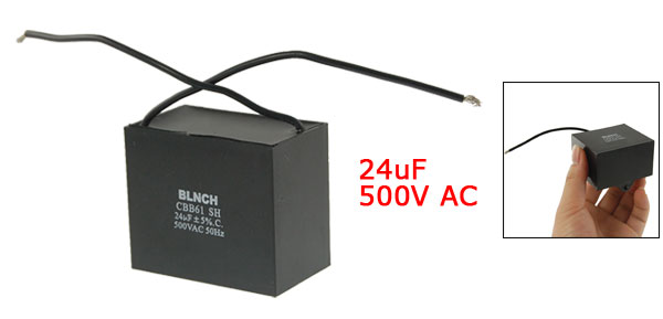 Product Name Motor Capacitor Model CBB61 Material(External) Plastic Rated Capacitance 24uF Tolerance ±5% Rated Frequency 50Hz Rated Voltage 500V AC Size 5.7 x 4.9 x 3.5cm/2.2" x 1.9"x 1.4"(L*W*T) Cable Length 12.5cm/4.9" Weight 103g Package Content 1 x Motor Running Capacitor - Reviews