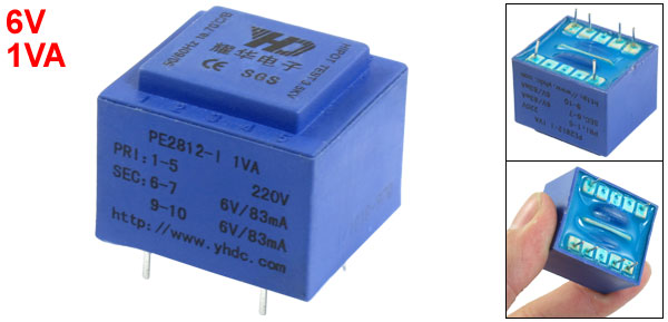 Product Name Encapsulated Transformer Model No. PE2812-1 Primary Work Voltage 220V Work Frequency 50-60Hz Insulation Grade Grade B Power 1VA Primary Pin 1-5 Secondary Pin 6-7 Primary Iutput Voltage 220V Secondary Output Current 83mA Secondary Output Voltage 6V Mounting Height 30mm/ 1.1" Number of Pins 6 Pin Length 6mm/ 0.236" Pin Diameter 0.8mm/ 0.031" Overall Size(Approx.) 31 x 27 x 25mm/ 1.2" x 1.06" x 1" (L*W*H) Material Epoxy Resin Color Blue Weight 74g Package Content 1 x Encapsulated Transformer - Reviews