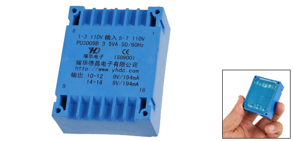 Product Name Encapsulated Transformer Model No. PU3009B Primary Input 1-3: 110V 5-7 : 220V Work Frequency 50-60Hz Insulation Grade Grade B Power 3.5VA Primary Pin 1-3/ 5-7 Secondary Pin 10-12/ 14-16 Secondary Full-load Voltage 2 x 9V Secondary Output Current 194mA x 2 Mounting Height 20mm/ 0.79" Number of Pins 8 Pin Diameter 0.8mm/0.031" Block Size 53 x 42mm/ 2.09" x 1.65" (L*W) Material Epoxy Resin Main Color Blue Weight 146g Package Content 1 x Encapsulated Transformer - Reviews