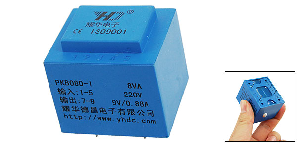 Product Name Encapsulated Transformer Model No. PKB08D-I Primary Work Voltage 220V Work Frequency 50-60Hz Insulation Grade Grade B Power 8VA Primary Pin 1-5 Secondary Pin 7-9 Primary Iutput Voltage 220V Secondary Output Current 0.88A Secondary Output Voltage 9V Mounting Height 40mm/ 1.57" Number of Pins 4 Pin Length 6mm/ 0.236" Pin Diameter 0.8mm/ 0.031" Overall Size(Approx.) 44 x 37 x 46mm/ 1.73" x 1.45" x 1.81" (L*W*H) Material Epoxy Resin Color Blue Weight 242g Package Content 1 x Encapsulated Transformer - Reviews