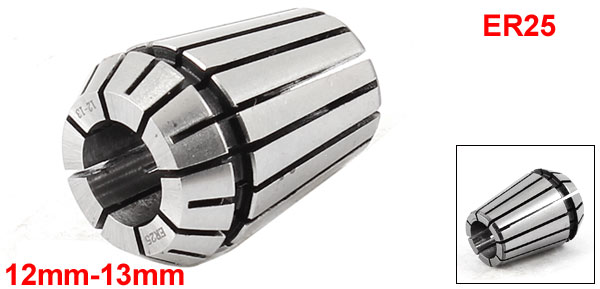 Product Name Spring Collet Model No. ER25 Clamping Range 12mm-13mm/ 15/32"-33/64" Clamping Diameter 13mm/ 33/64" Overall Size 25 x 35mm/ 1" x 1.4"(Max.Dia*H) Material Stainless Steel Color Silver Tone Net Weight 54g Package Content 1 x Spring Collet - Reviews