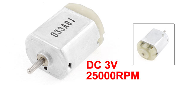 Product Name DC Toy Motor Model NO. FA130-RA Rated Voltage DC 3V Speed 25000RPM Body Size 29 x 20 x 16mm / 1.1" x 0.8" x 0.63"(L*W*T) Shaft Size 2 x 8mm/ 0.08" x 0.31"(D*L) Total Length 38mm / 1.5" Main Color Silver Tone Material Metal, Plastic Weight 21g Package 1 x DC Toy Motor - Reviews