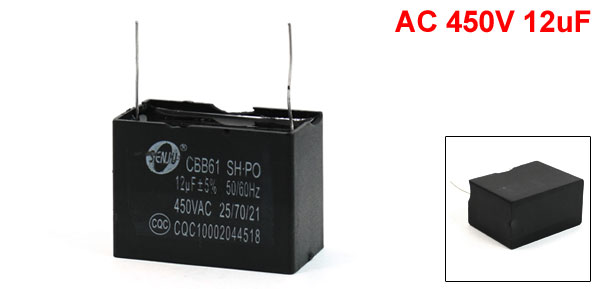 Product Name Motor Capacitor Housing Material Plastic Dielectric Material Metallized Polypropylene Film Model CBB61 Capacitance 12uF Tolerance ±5% Rated Voltage 450VAC Frequency 50/60Hz Body Size 48 x 26 x 35mm/ 1.89" x 1.02" x 1.38" (L*W*H) Lead Diameter 0.9mm/0.035" Color Black Weight 46g Package Content 1 x Motor Capacitor - Reviews