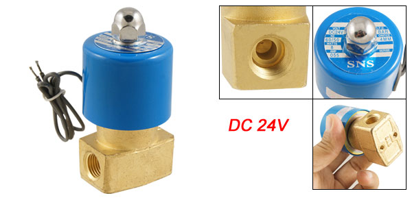 DetailsFB2E-V DC24V 1/2" 2 Positions 2 Ways Air Solenoid Valve  Product Name Solenoid Valve Model FB2E-V Action Type Direct Action Type Two-position, Two-way Use Fluid Air, Water, Oil, Gas Switch Type NC Bottom Thread Dia 4mm/ 5/32" Joint Pipe Bore 12mm/ 1/2'' Fluid Viscosity <20CST Pressure 0~7kgf/cm2 Operating Temperature -5 ~ 85 °C Voltage DC 24V Total Size 4 x 8.5cm/ 1.6'' x 3.3''(D*H) Cable Length 20cm/ 7.8'' External Material Metal Color Brass Tone, Blue Net Weight 408g Package Content 1 x Solenoid Valve