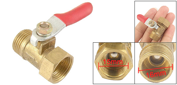 Product Name Full Port Ball Valve Thread Diameter Female: 15mm/0.59" Male: 16mm/0.63" Ball Hole Diameter 6mm/0.24" Length 33mm/1.3" Level Handle Size 45 x 11mm/1.77" x 0.43" (L*W) Total Size 55 x 22 x 33mm/2.2" x 0.87" x 1.3" (L*W*H) Color Gold Tone & Red Material Metal Weight 35g Package 1 x Full Port Ball Valve - Reviews