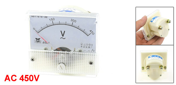 Product Name Analog Voltmeter Model 85L1 Measuring Current Range AC 450V Accuracy Class 2.5 Meter Face Size(Approx.) 6.3 x 5.5 x 1.1cm/ 2.5" x 2.2" x 0.4"(L*W*T) Mounting Size Screw Size: 3 x 8mm / 0.11" x 0.31"(D*L)