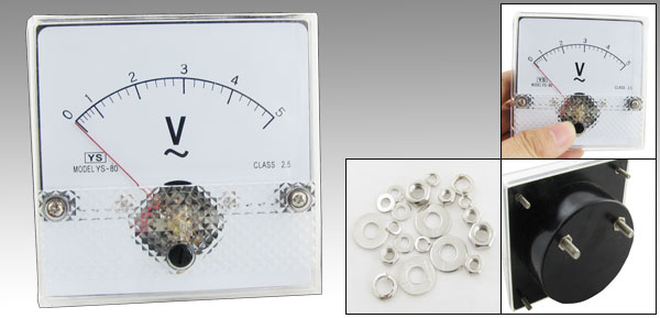 Product Name Analog Voltmeter Measuring Voltage Range AC 0-5V Accuracy Class 2.5 Meter Face Size(Approx) 8 x 8 x 1.3cm / 3.1" x 3.1" x 0.5"(L*W*T) Thread Size 0.48 x 1.3cm / 0.19" x 0.5"(D*L) 0.3 x 0.9cm / 0.11" x 0.35"(D*L) Overall Depth 3.5cm / 1.37" Color White, Black Net Weight 104g Package Content 1 x Analog Voltmeter Several Installing Parts - Reviews