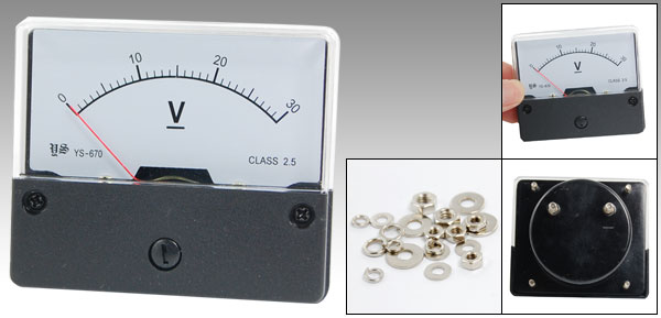 Product Name Analog Voltmeter Model YS-670 Measuring Voltage Range DC 0-30V Accuracy Class 2.5 Meter Face Size(Approx) 7 x 5.8 x 1.2cm/ 2.7" x 2.3" x 0.5"(L*W*T) Thread Size 0.4 x 1cm / 0.15" x 0.4"(D*L) 0.3 x 0.9cm/ 0.11" x 0.35"(D*L) Overall Depth 3.5cm/ 1.4" Color Black, White Net Weight 72g Package Content 1 x Analog Voltmeter Several Installing Parts - Reviews