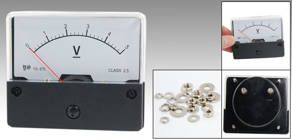 Product Name Analog Voltmeter Model YS-670 Measuring Voltage Range DC 0-5V Accuracy Class 2.5 Meter Face Size(Approx) 7 x 5.8 x 1.2cm/ 2.7" x 2.3" x 0.5"(L*W*T) Thread Size 0.4 x 1cm / 0.15" x 0.4"(D*L) 0.3 x 0.9cm/ 0.11" x 0.35"(D*L) Overall Depth 3.5cm/ 1.4" Color Black, White Net Weight 71g Package Content 1 x Analog Voltmeter Several Installing Parts - Reviews