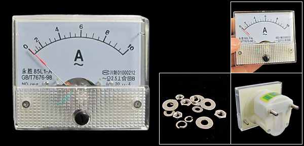 Product Name Analog Ammeter Model 85L1-A Measuring Current Range AC 0-10A Accuracy Class 2.5 Meter Face Size(Approx) 6.3 x 5.5 x 1cm / 2.5" x 2.2" x 0.39"(L*W*T) Thread Size 0.4 x 0.8cm / 0.16" x 0.31"(D*L) 0.3 x 0.8cm / 0.12" x 0.31"(D*L) Overall Depth 4.6cm / 1.8" Color White Net Weight 94g Package Content 1 x Analog Ammeter Several Installing Parts - Reviews