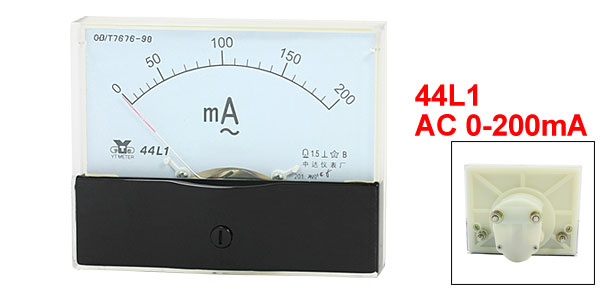 Product Name Analog Ammeter Type 44L1 Measuring Current Range AC 0-200mA Accuracy 1.5 Operating Temperature -20 ~ 40 °C Insulation Force AC 2KV, 50Hz Panel Size(Approx) 100 x 80 x 12mm / 3.9" x 3.1" x 0.47"(L*W*T) Thread Size Long One: 4 x 11mm / 0.16" x 0.43"(D*L)
