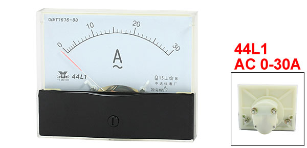 Product Name Analog Ammeter Type 44L1 Measuring Current Range AC 0-30A Accuracy 1.5 Operating Temperature -20 ~ 40 °C Insulation Force AC 2KV, 50Hz Panel Size(Approx) 100 x 80 x 12mm / 3.9" x 3.1" x 0.47"(L*W*T) Thread Size Long One: 4 x 11mm / 0.16" x 0.43"(D*L)
