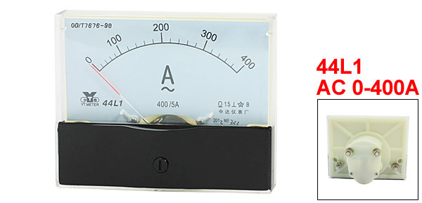 Product Name Analog Ammeter Type 44L1 Measuring Current Range AC 0-400A Accuracy 1.5 Operating Temperature -20 ~ 40 °C Insulation Force AC 2KV, 50Hz Panel Size(Approx) 100 x 80 x 12mm / 3.9" x 3.1" x 0.47"(L*W*T) Thread Size Long One: 4 x 11mm / 0.16" x 0.43"(D*L)