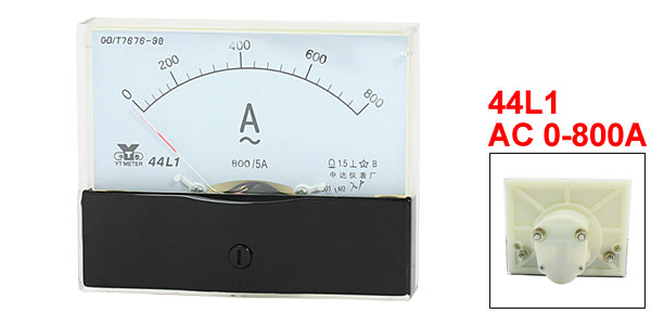 Product Name Analog Ammeter Type 44L1 Measuring Current Range AC 0-800A Accuracy 1.5 Operating Temperature -20 ~ 40 °C Insulation Force AC 2KV, 50Hz Panel Size(Approx) 100 x 80 x 12mm / 3.9" x 3.1" x 0.47"(L*W*T) Thread Size Long One: 4 x 11mm / 0.16" x 0.43"(D*L)