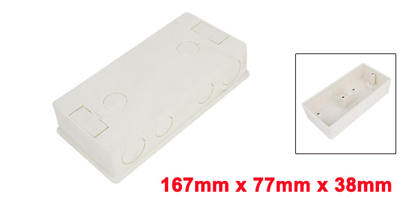 Product Name Junction Box Mounted Type Flush Type Installing Thread Hole Diameter 4mm/ 0.2" Installing Thread Hole Center Distance 155mm/ 6.1" Panel Size 167 x 77mm/6.6" x 3"(L*W) Mounted Size 162 x 75 x 33mm/ 6.4" x 3" x 1.3"(L*W*H) Total Height 38mm/1.5" Material PVC Color White Net Weight 100g Package 1 x Junction Box - Reviews