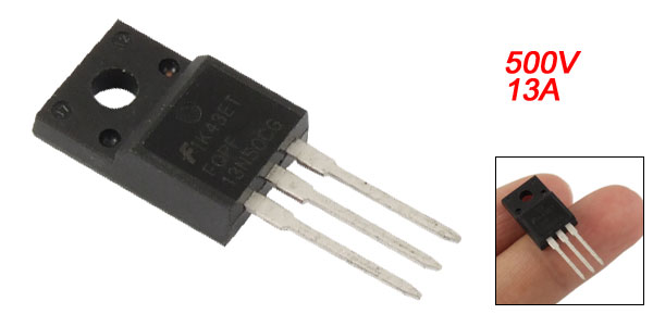Product Name N-Channel MOSFET Model No. FQPF13N50C Drain Source Voltage 500V Drain Current 13A Mounting Hole Diameter 3mm/ 0.118" Pin Size 13 x 1mm/ 0.51" x 0.039" ( L* Pitch) Total Size 29 x 10 x 4.5mm/ 1.14" x 0.39" x 0.18" (L*W*H) Weight 2.5g Package 1 x N-Channel MOSFET - Reviews