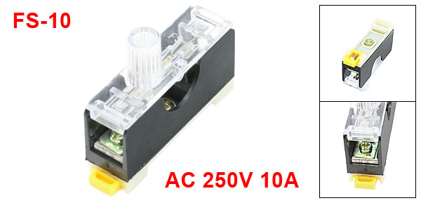 Product Name Fuse Holder Base Model FS-10 Rated Voltage AC 250V Rated Current 10A Pole Quantity 1 Fuse Size 6 x 30mm(D*L) Mounting Rail Type 35mm DIN Rail Material Plastic, Metal Total Size 60 x 16 x 45mm/ 2.4" x 0.6" x 1.8" (L*W*H) Weight 19g Package Content 1 x Fuse Holder Base w Fuse - Reviews