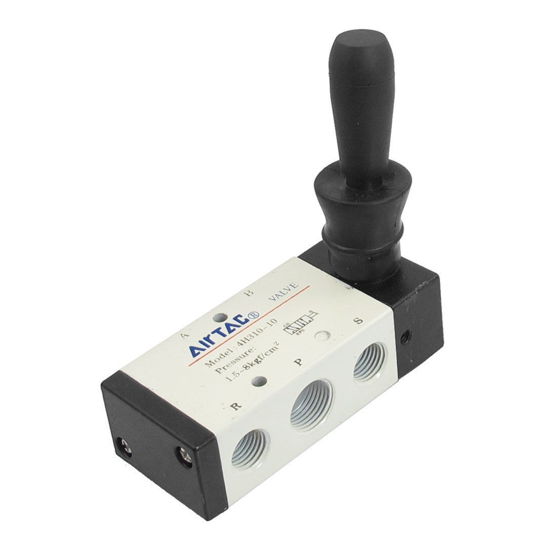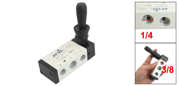 DetailsG 1/4 Inlet 3/8 Exhaust Plastic Grip Hand Lever Valve  Product Name Hand Lever Valve Color Black, Off White Air Inlet Port G1/4 Air Outlet Port G1/4 Exhaust Port G3/8 Operating Temperature Range 0~60 degree Working Pressure Range 0.15-0.8MPa Lever Size 70 x 28mm/ 2.7" x 1.4" (L*Max.D) Valve Size 92 x 30 x 23mm/ 3.6" x 1.2" x 0.9" (L*W*H) Material Plastic, Rubber, Metal Weight 239g Package 1 x Hand Lever Valve