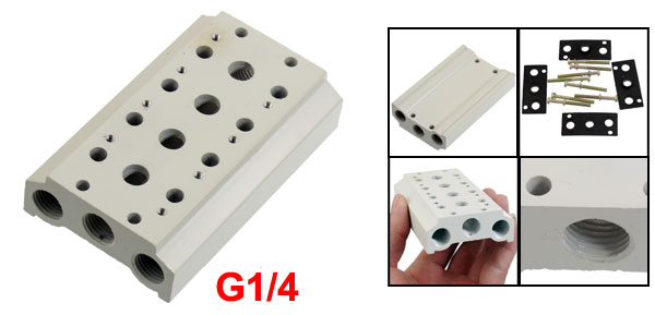 Product Name Solenoid Valve Base Model 100M-4F Stations 4 Press 0-0.8MPa Nominal Bore 8mm / 0.3" Tube Hole G1/4 Mounting Hole Diameter 3mm / 0.12" Total Size(Approx) 9.4 x 5.9 x 2.3cm / 3.7" x 2.3" x 0.89" (L*W*T)