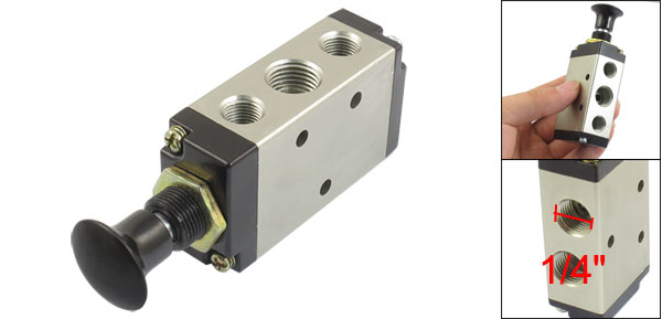 Product Name Hand Pull Valve Model 4R210-08 Operation Type Manual Number of Place Single-Head, Double-Position Working Medium Clear Air (40µm filteration) Position and Port Number 5 Port 2 Position Port Size Air Inlet=G1/4" Air Outlet=G1/4" Air Exhaust=G1/8" Operating Temperature Range 0~60°C Effective Sectional Area (mm)² 16mm²(CV=0.89) Working Pressure Range 1.5~8kgf/cm² Total Size(Approx) 3.5 x 2.2 x 9.9cm / 1.4"x 0.9"x 3.9" (L*W*H) Material Alloy Main Color Silver Tone, Black Net Weight 118g Package Content 1 x Hand Pull Valve - Reviews