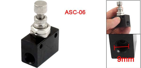 Product Name Flow Control Valve Model ASC-06 Flow Direction One-Way Restrictive Valve Working Medium Air Joint Pipe Bore Size G1/8" Female Thread Dia 9mm/ 0.35" Working Pressure 0~0.95MPa Working Temperature 0~60 C Installing Thread Diameter 11.5mm/ 0.45" Suitable Board(Max) 3mm/ 0.12"(Adjustable) Fixed Hole Diameter 4mm/ 0.16" Body Size 35 x 18 x 27mm/ 1.38" x 0.71" x 1.06"(L*W*H) Overall Size 35 x 18 x 58mm/ 1.38" x 0.71" x 2.28"(L*W*H) Material Metal Main Color Black Net Weight 58g Package Content 1 x Flow Control Valve - Reviews