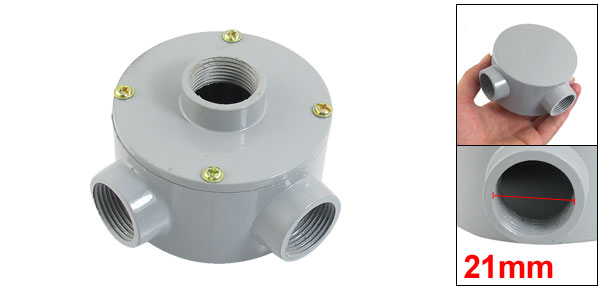 DetailsG3/4" Thread Three Holes Conduit Wiring Round Metal Junction Box  Product Name Junction Box Hole Quantity 3 Female Thread Diameter 21mm Hole Size G3/4" Total Size (Approx) 9.4 x 9.4 x 5.9cm / 3.7" x 3.7" x 2.3" (L*W*H) Material Metal Main Color Gray Weight 139g Package 1 x Junction Box