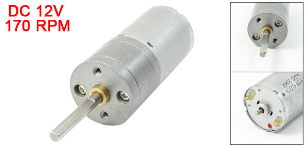 Product Name DC Geared Motor Rated Voltage DC 12V Rated Current 35mA Rated Speed 170 RPM Shaft Size 18 x 4mm/ 0.71'' x 0.16''(L*D) Motor Body Length 52mm/2" Motor Body Diameter 25mm/1" Material Metal, Electronic Parts Color Silver Tone Weight 90g Package Content 1 x Geared Motor - Reviews