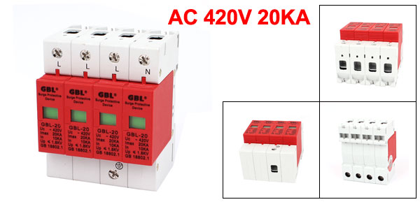 Product Name Surge Protector Model GBL-20 Pole 4P Voltage(Uc) AC 420V Maximum Dishcharging Current 20KA Nominal Dishcharging Current (In) 10KA Portection Level <=1.8KV Dimension 90 x 70 x 60mm/ 2.5" x 2.8" x 2.4" (L*W*H)