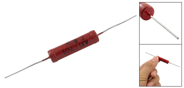 Product Name Glass Glaze Film Resistor Resistance Value 50MΩ Power Rating 3W Rated Voltage 5KV Pin Size(Each Side) 27 x 1mm/ 1.06" x 0.039"(L*D) Body Size 3x 0.8cm/ 1.18" x 0.3" (L*D) External Material Glass Glaze, Metal Color Red, Silver Tone Weight 7g Package Content 1 x High Voltage Glaze Resistor - Reviews